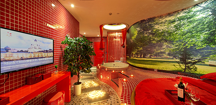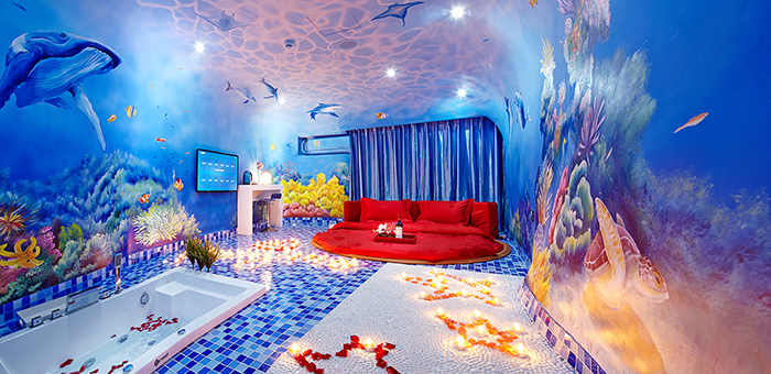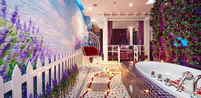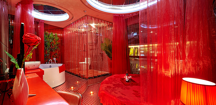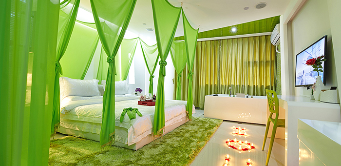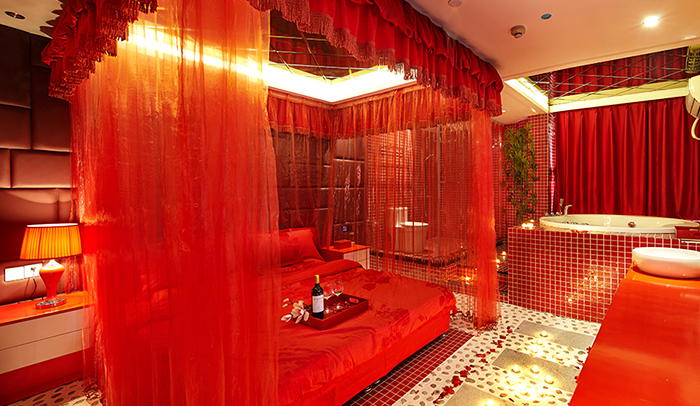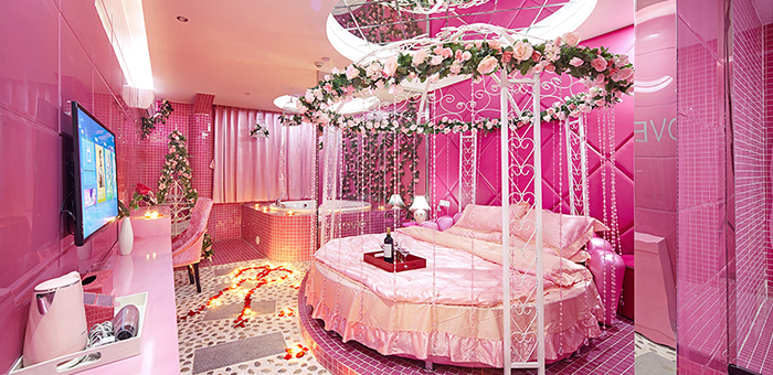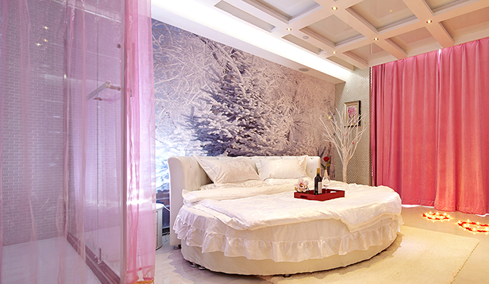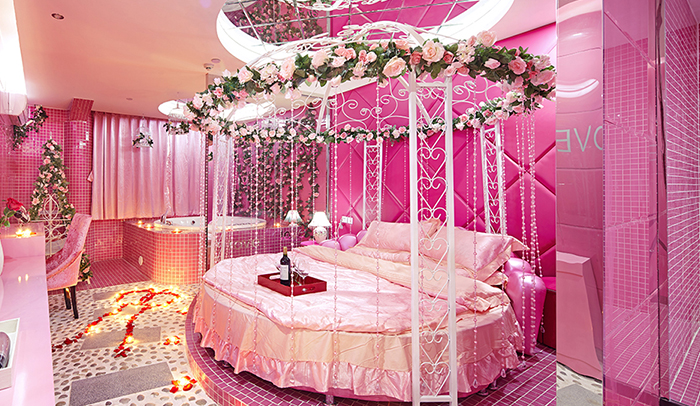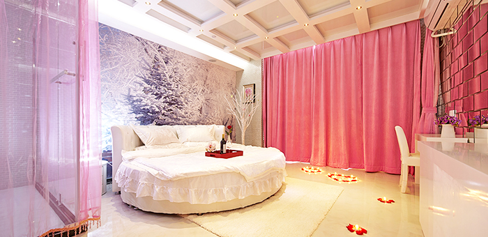 蜜桃粉、冲浪浴缸、圆水床、有窗