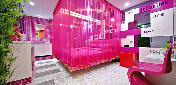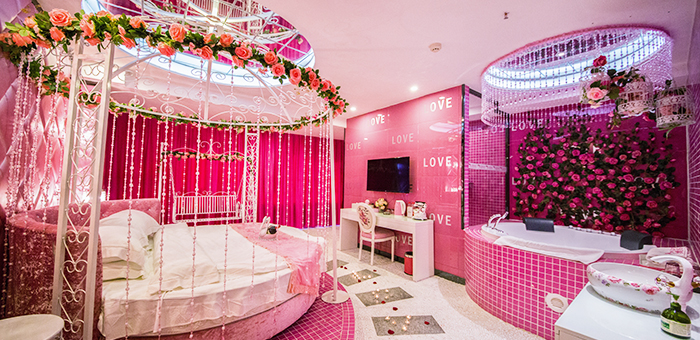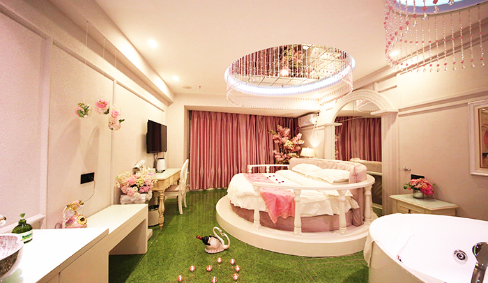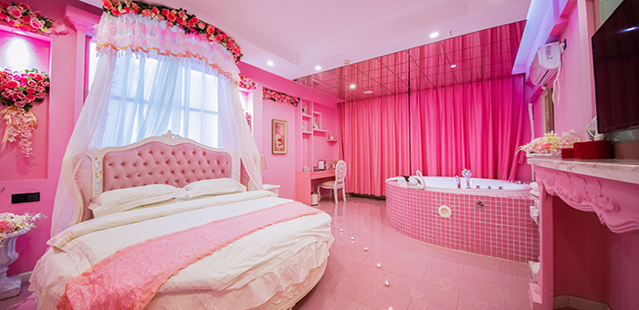 蜜桃粉,圆床,冲浪浴缸,有窗