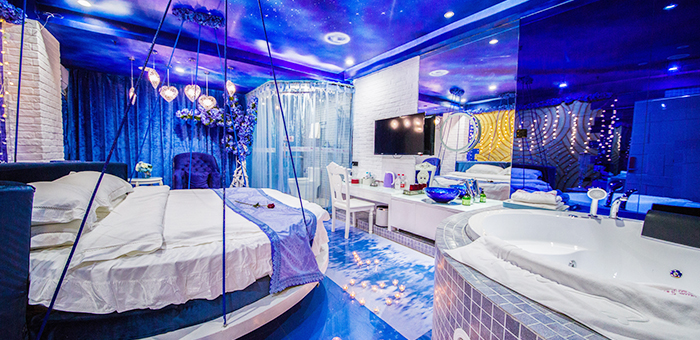 魅惑蓝,圆床,冲浪浴缸,有窗