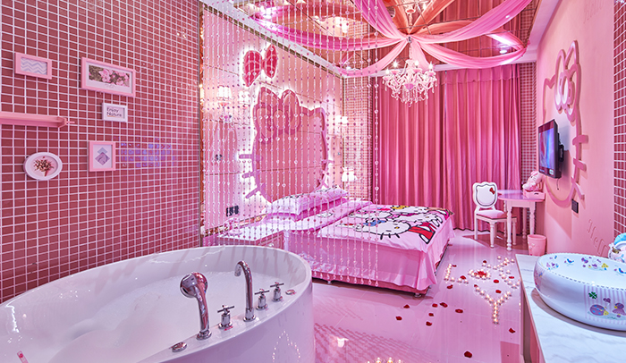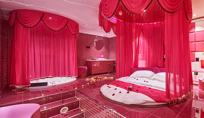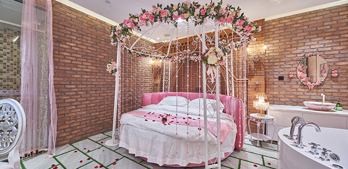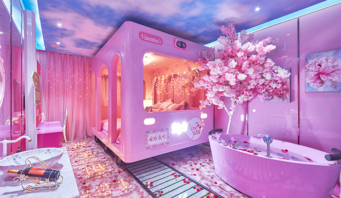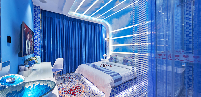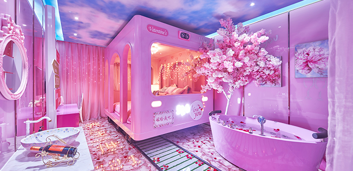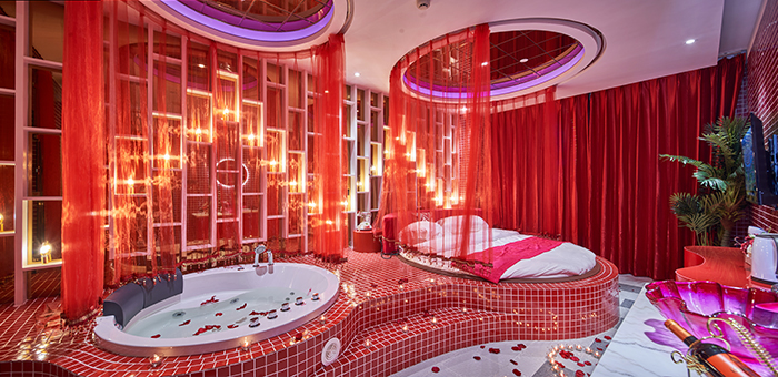 36间心动主题房,演绎浪漫情怀,智能音影,按摩浴缸护航温馨之夜。