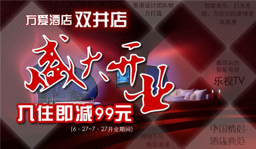 万爱双井店,开业期间大酬宾,活动期间办理入住,立享99元现金优惠,更多精彩更多优惠尽请关注万爱酒店官方微博、官方微信,浪漫,更加爱你!万爱双井旗舰店,将继续书写中国情侣酒店的新辉煌!