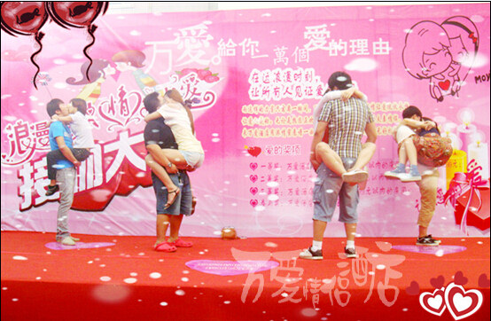 2014年7月3日万爱情侣酒店武汉江汉步行街店开业,7月份实现97.3%的入住率;8月实现113%的入住率。喜欢浪漫的粉丝让万爱情侣酒店爆表,一对情侣晚上了还耐心的守候在前台,期冀能有已入住的情侣提前退房;前台劝说,明天后天还有几间,你们可以挑选自己喜欢的房间,明天或后天来体验。男孩抬起征询的眼光,立刻被女孩愠怒的眼神给秒杀了,乖乖的在前台继续等候着。功夫不负有心人,半个小时后有客人退房;男孩帮着客房大姐打扫整理房间,只为了能够早几分钟去体验那浪漫甜蜜的感觉!