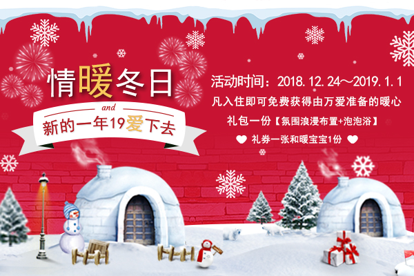 你来万爱躲避严寒,万爱给你们送温暖。凡2018.12.24~2019.1.1来万爱入住的小情侣们均可获得万爱独家提供的冬日浪漫礼券【氛围浪漫布置&泡泡浴】以及暖宝宝一贴。