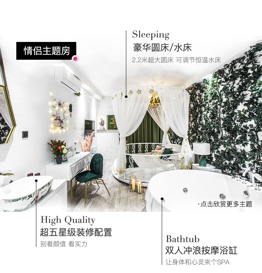 当苏州遇见浪漫,会碰撞出怎样的惊喜?答案都在苏州观前店情侣主题房。还是那些梦幻主题,不同的是这一次有大面积景观窗。即使身处室内,白墙黑瓦的苏氏风景也可尽收眼底。顶层部分房间还配备露台花园,藤本月季的花圃、清澈的水池、精致的桌椅将这里打造成秘密爱情花园,和爱人一起在露台喝杯咖啡,耳鬓厮磨说着一生一世一双人的诺言。