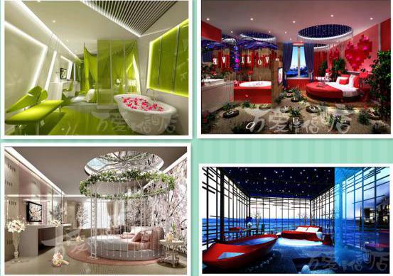 以这间“海誓”为例,深邃的夜空星光点点,一闪一闪;远方的海滩一望无际,设计师高超的壁画工艺给人将海的烟雾缭绕带给住客;房间的蓝色马赛克地砖达到海天一色的效果;浴缸和水床让人在盛夏的午后寻得一份安逸自在。中国恐怕再也找不出第二家能将主题房做得如此有创意、效果做的如此逼真,人景融为一体感觉的酒店。