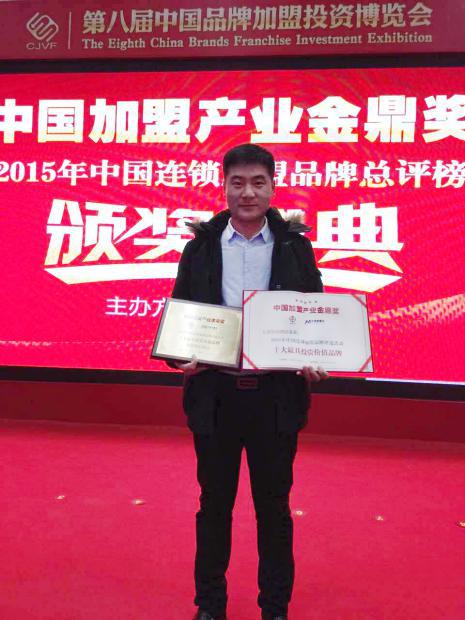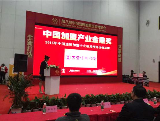 2015年12月19日,由中国加盟网主办的第八届中国品牌加盟投资博览会在北京国家会议中心璀璨开幕。该次展会吸引了涵盖教育、幼儿、餐饮、美容、金融、家居、酒店等十八大行业前来参展。在2015中国加盟产业金鼎奖颁奖盛典中,万爱情侣主题酒店获得网络投票34785票支持,打败众多知名品牌,夺得中国加盟产业金鼎奖中获评“十大最具投资价值品牌”第一名!