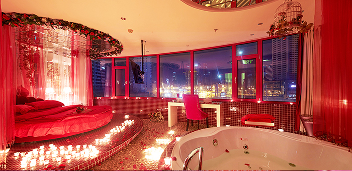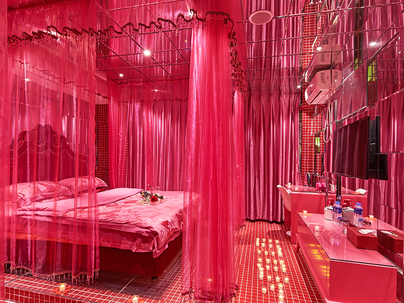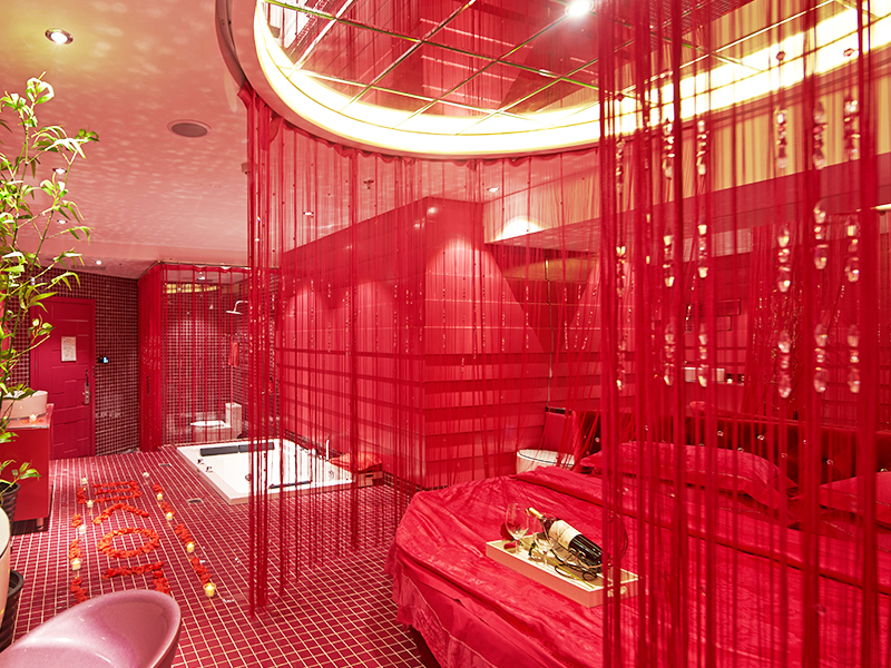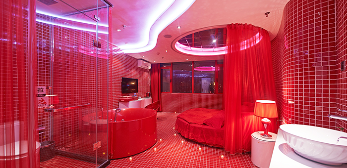 激情红、方床、心型浴缸、有窗