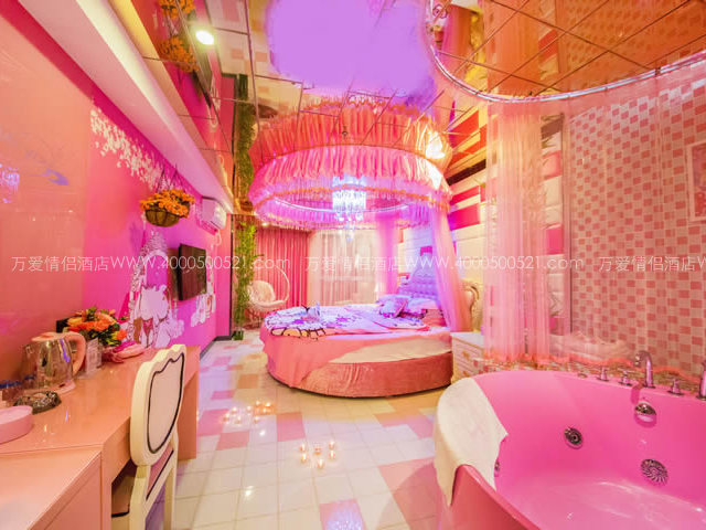 主题设施:公主粉,直圆床,冲浪浴缸,有窗