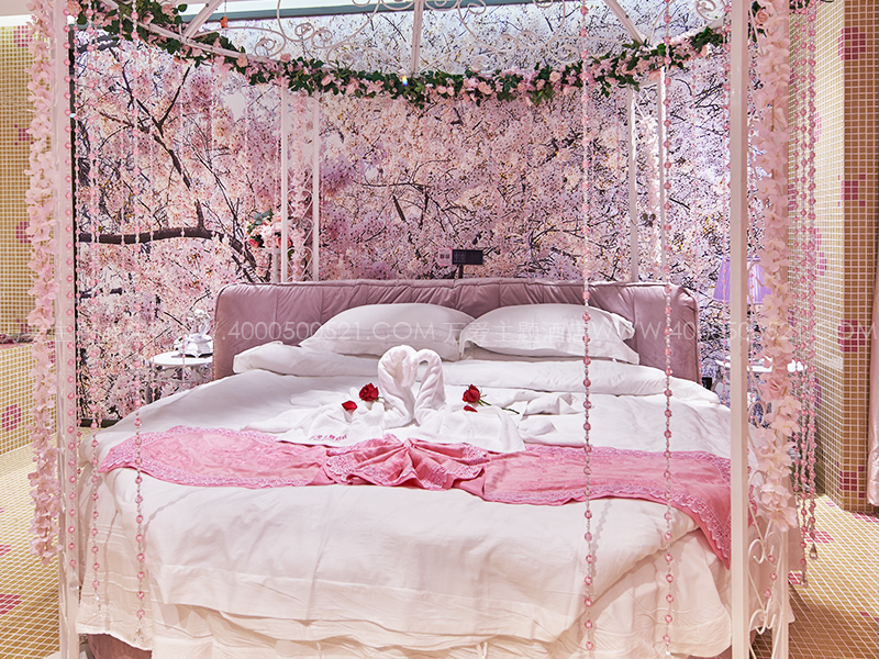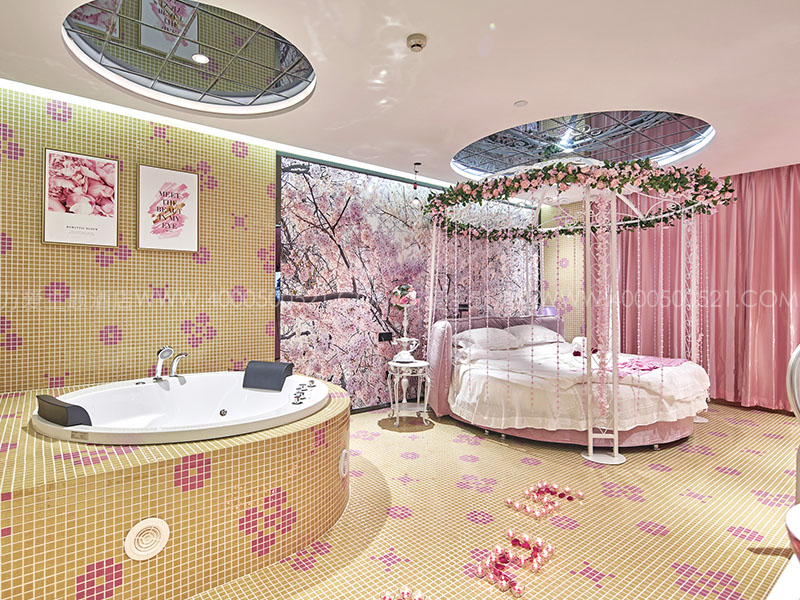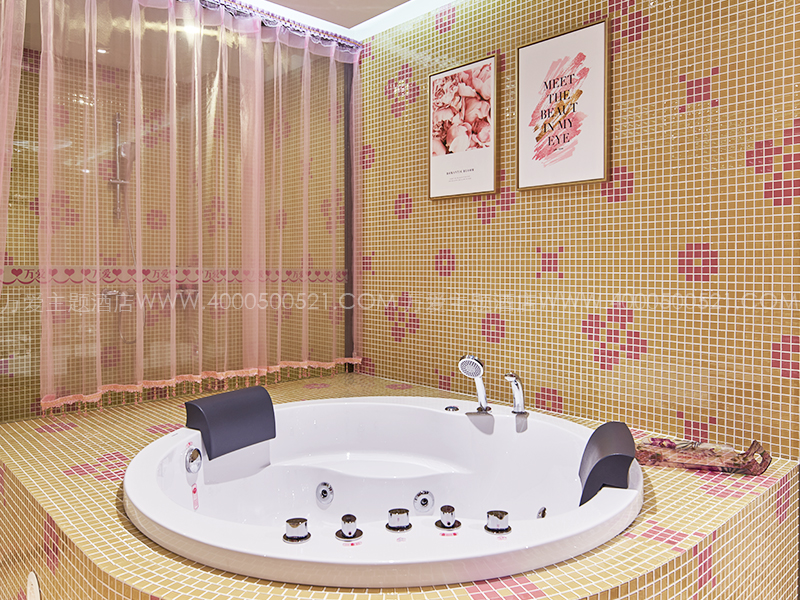 主题设施:粉,圆床,冲浪浴缸,有窗,苏式建筑群